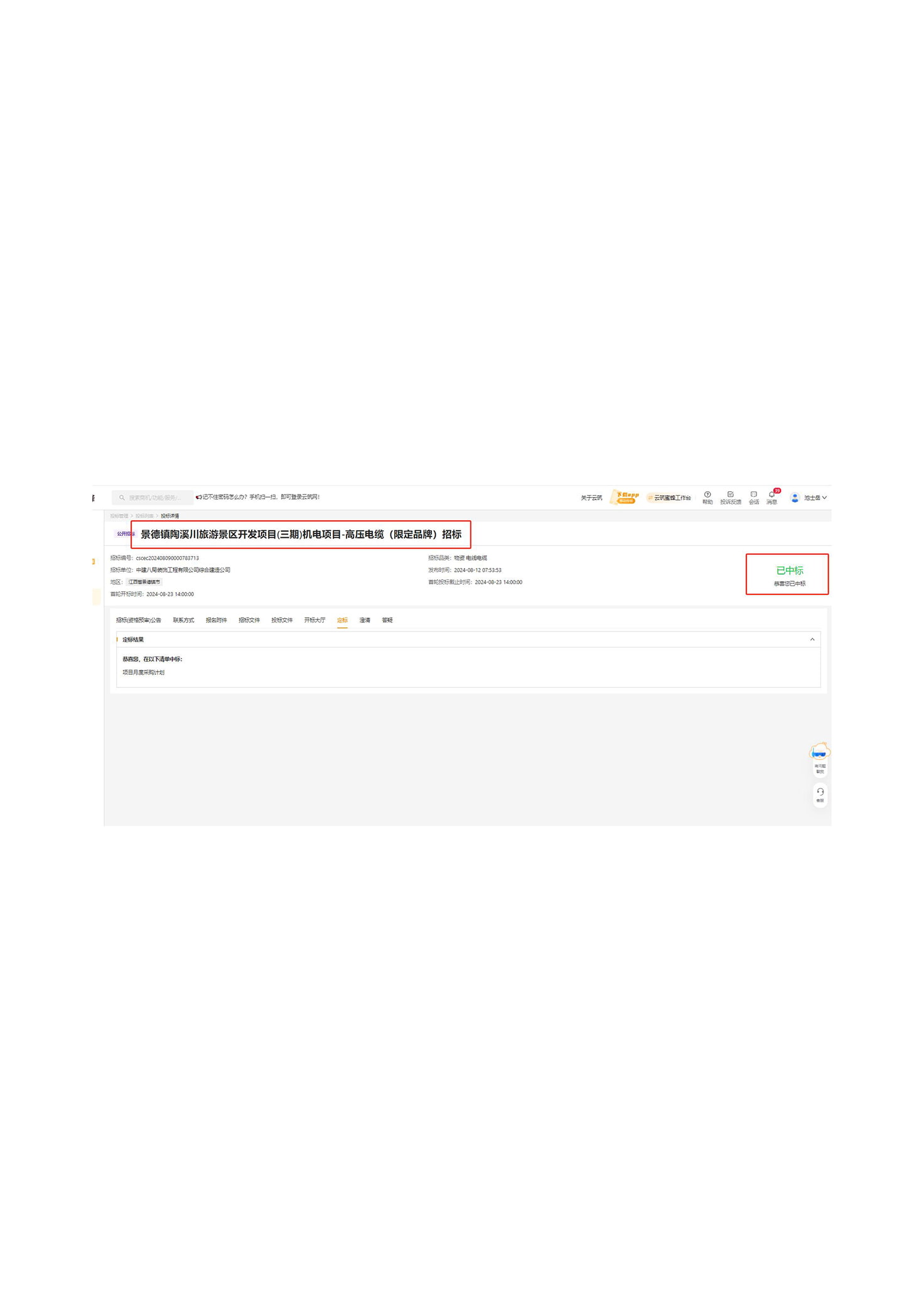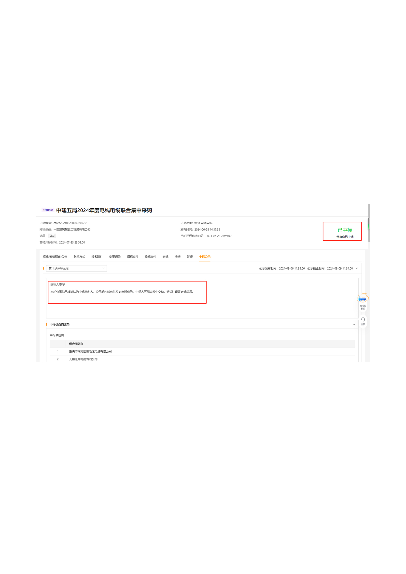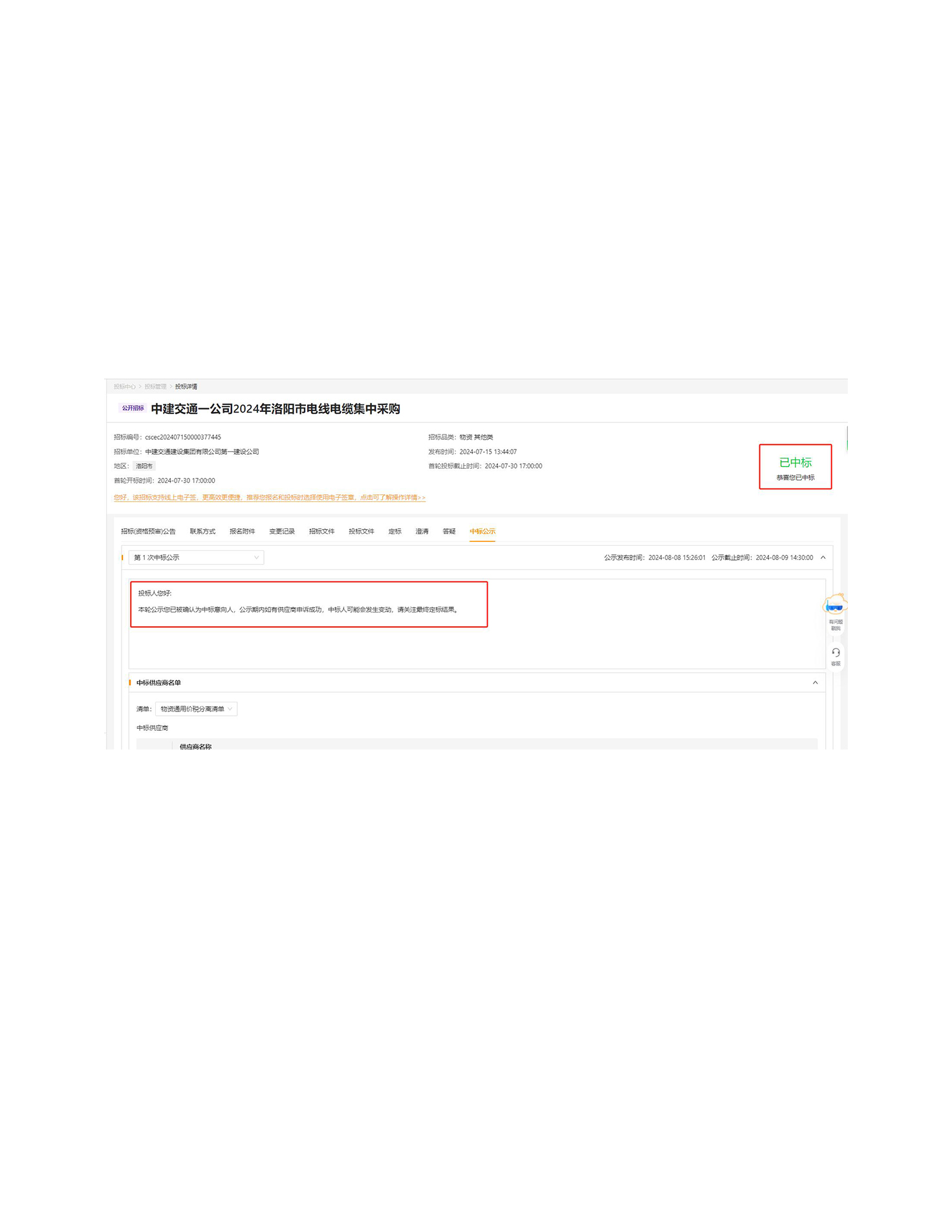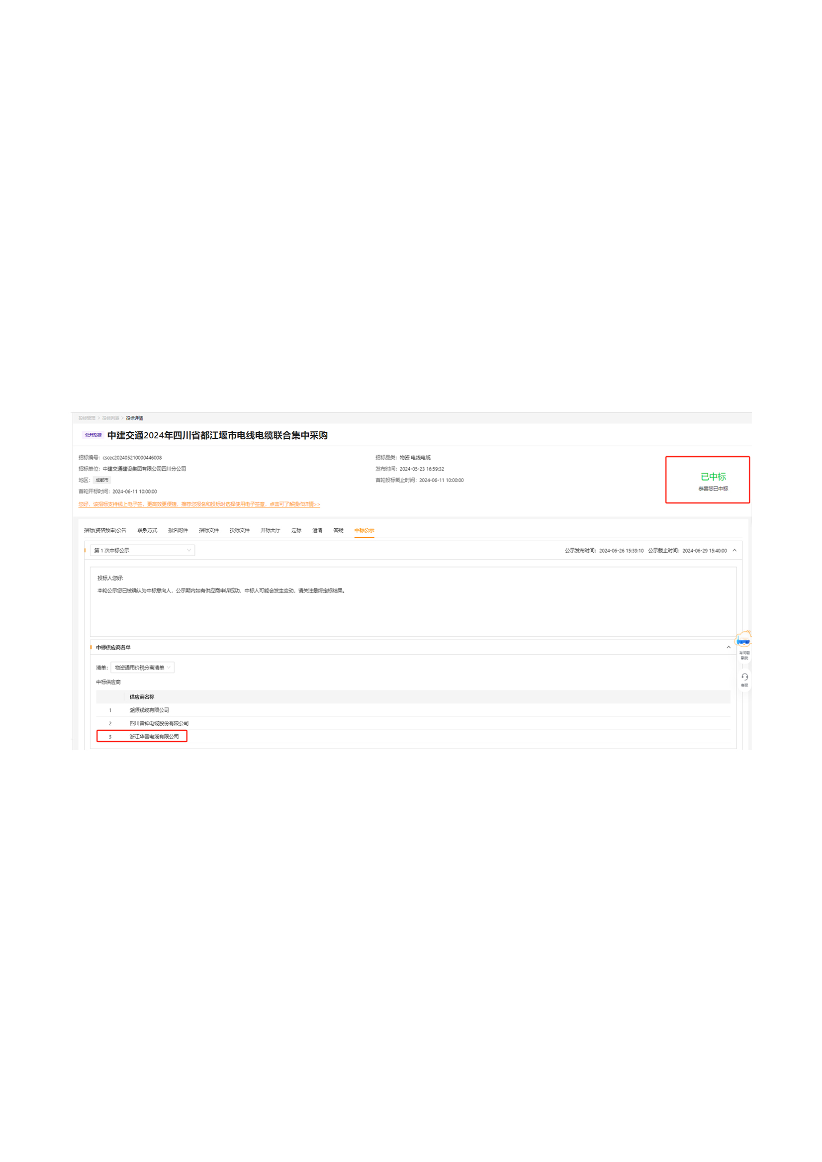 Извещение о победе в тендере на централизованную закупку проводов и кабелей в городе Лоян в 2024 году от компании «China Construction Communications First Company»
