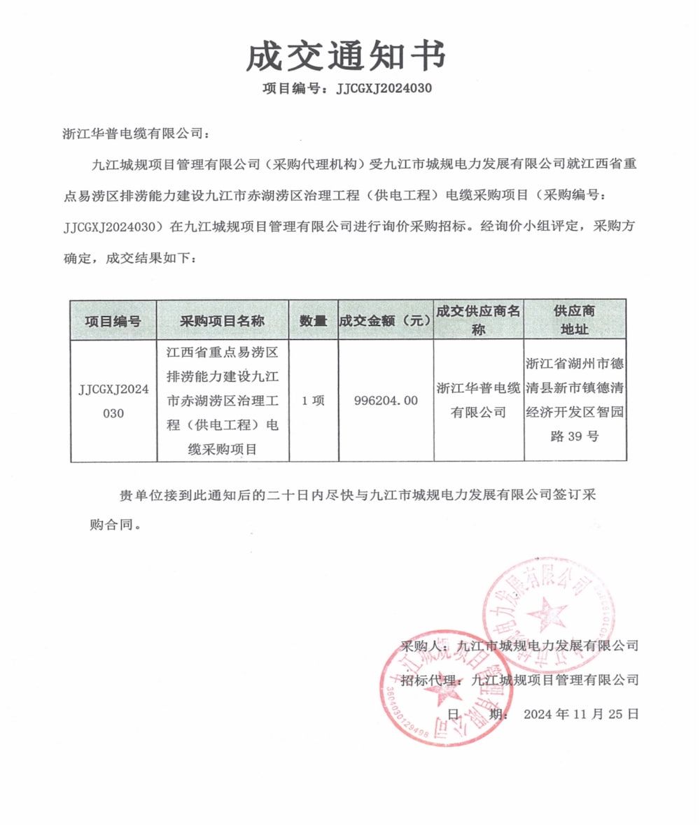 Уведомление о победе в тендере на закупку кабеля для проекта по борьбе с наводнениями в Цзюцзян-Чиху (проект электроснабжения) для строительства дренажных мощностей в ключевых районах, подверженных наводнениям в провинции Цзянси