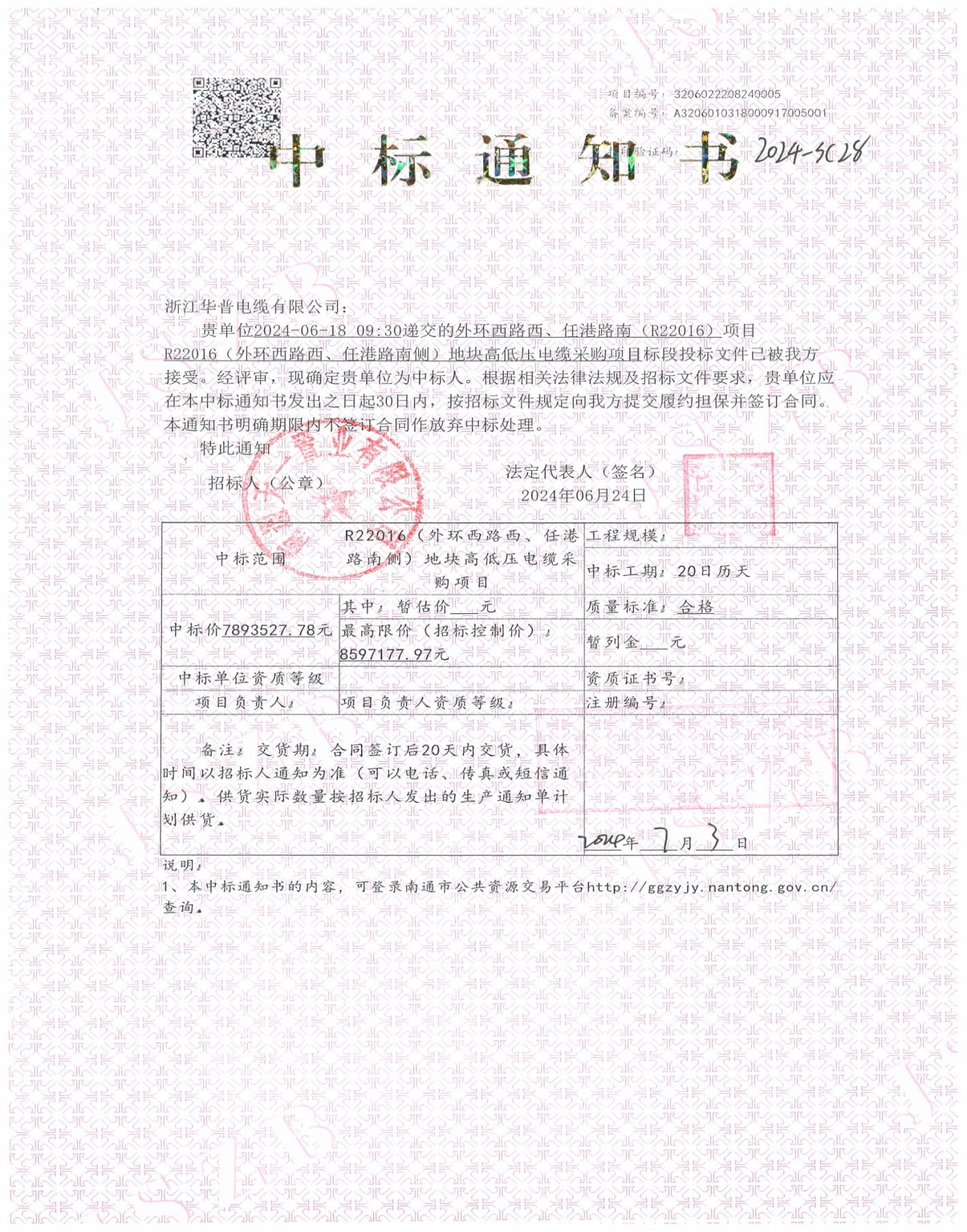 Уведомление о присуждении контракта на проект по закупке высоковольтного и низковольтного кабеля на участке R22016 (Западная внешняя кольцевая дорога, Южная дорога Ренганг)