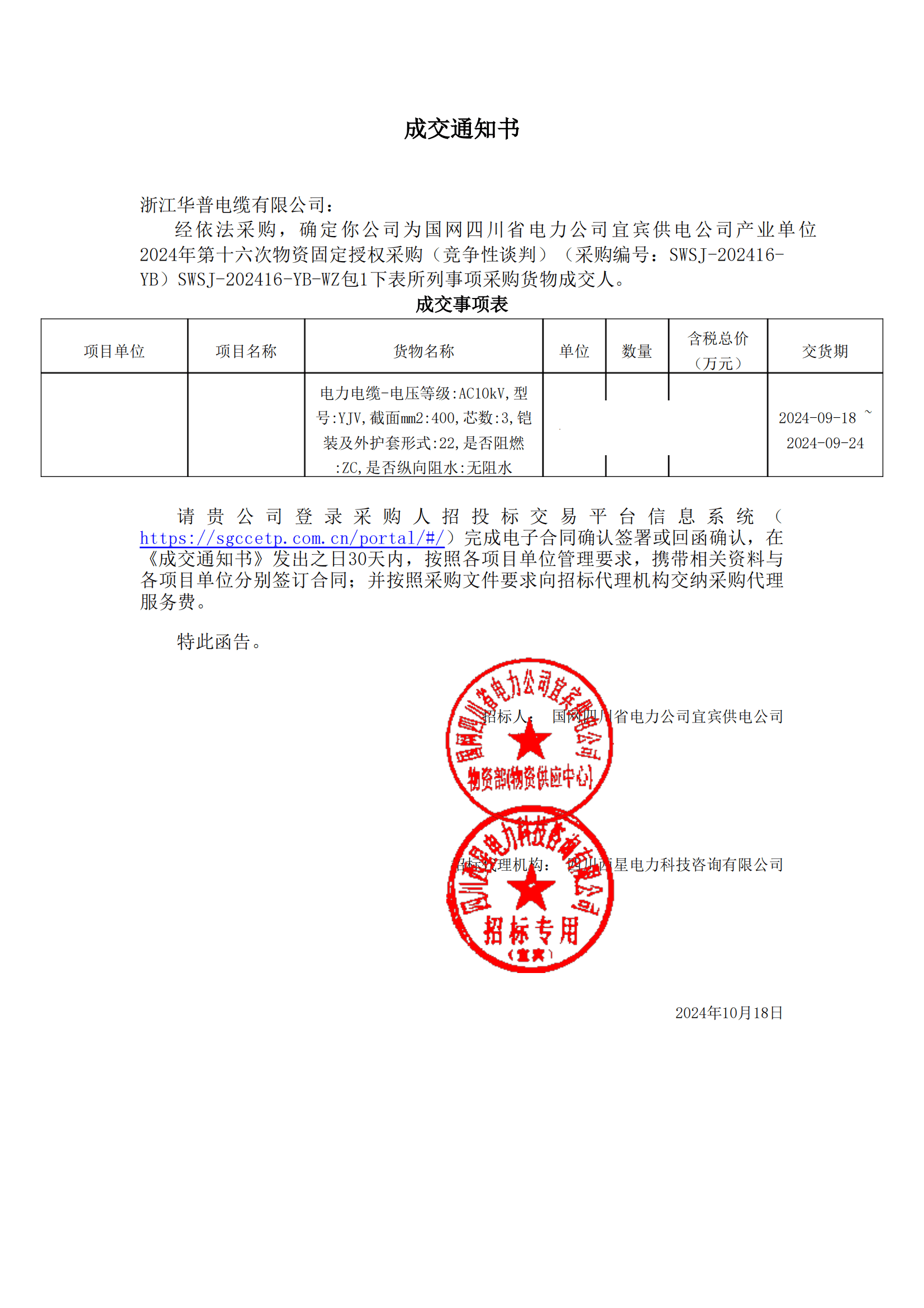 (Извещение о победе в тендере на высоковольтную продукцию) По итогам 16-й фиксированной авторизованной закупки материалов для промышленных подразделений компании «Yibin Power Supply Company» (подразделение «State Grid Sichuan Electric Power») в 2024 году (Конкурентный отбор)